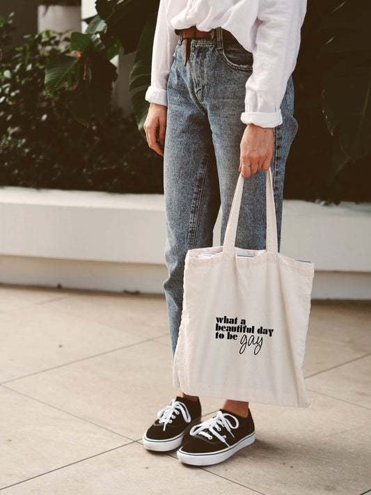 Baumwolltasche "what a beautiful day to be gay"