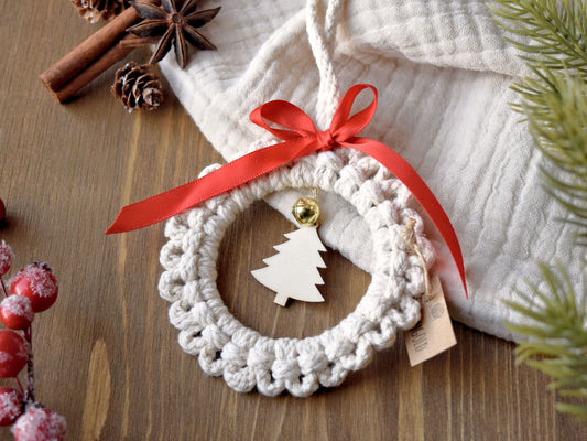 Makramee Weihnachtskranz mit Glöckchen und Tannenbaum