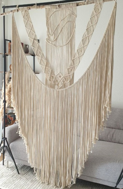 "Ich habe mich sehr über den Auftrag gefreut, denn das Makramee dient als Blickfang und Begrüßung für Gäste und Besucher. Es strahlt Wärme, Gemütlichkeit und eine einladende Atmosphäre aus. Es vermittelt den Gästen das Gefühl, dass sie an einem besonderen Ort angekommen sind, an dem jedes Detail mit Sorgfalt und Liebe gestaltet wurde." sagt Sarah von wollengold.