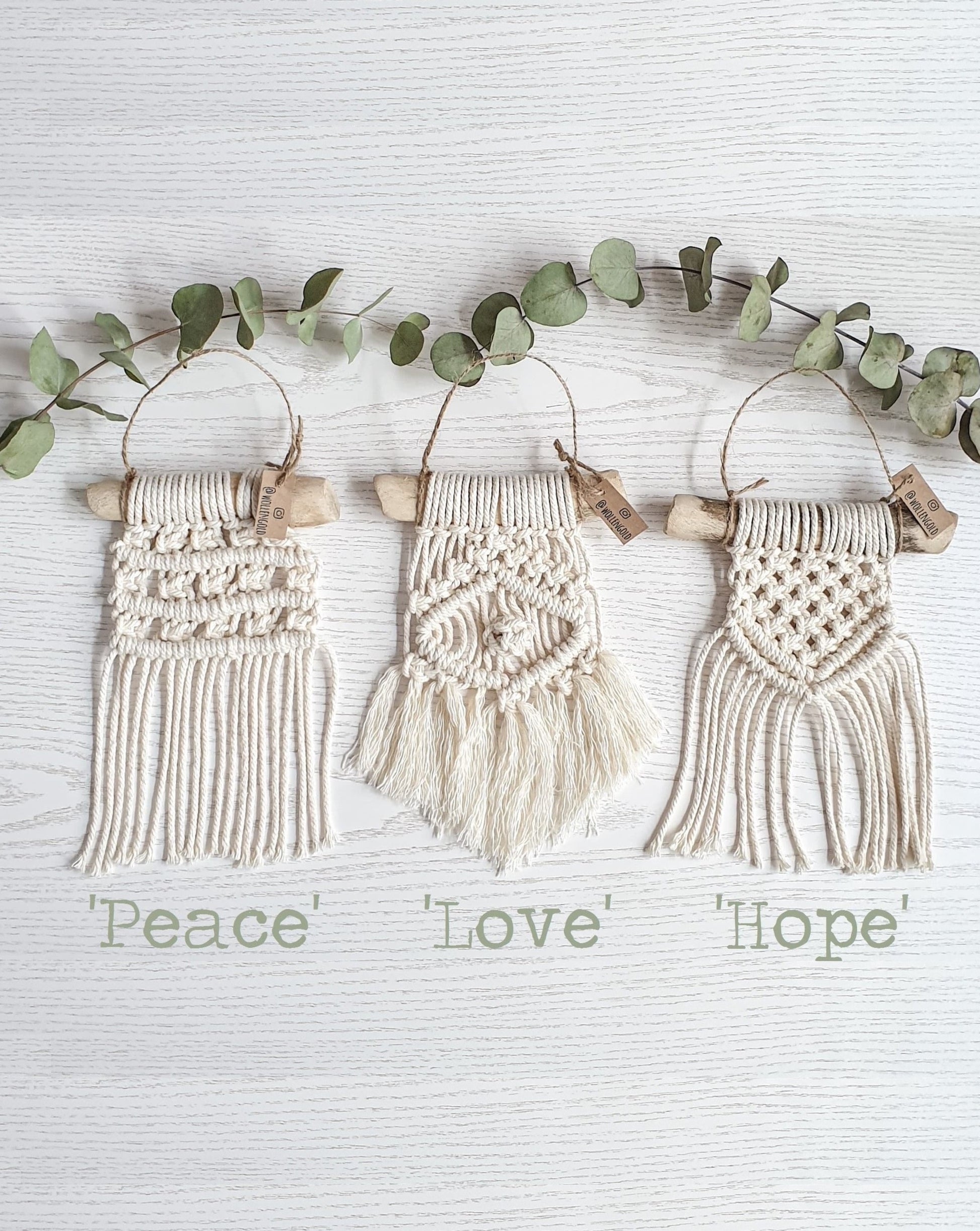 Makramee Wandbehang Set 3tlg. am Treibholz - LOVE PEACE HOPE